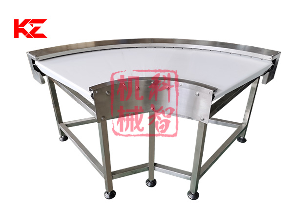 轉彎輸送機采用的形式有:網帶轉彎輸送機、鏈板式轉彎輸送機、皮帶式轉彎輸送機、鏈桿式轉彎輸送機、塑料模塊式轉彎輸送機等。轉彎角度有45度、90度、180度等等。轉彎食品輸送機的寬度和轉彎半徑均可根據需求定做。